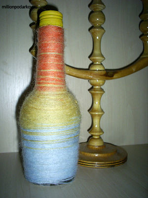 Берем нитки и начинаем обматывать ими нашу бутылку. Делать это лучше всего, начиная с горлышка и направляясь к основе поделки. Вначале закрепите нитку на клей ПВА. То же самое сделайте и в конце работы. В течение изготовления сувенира можете применять клей там, где это необходимо. Иногда нитки будут хорошо ложиться и без него, а иногда сползать или закатываться. Поэтому в течение работы можете постепенно наносить клей на бутылку и сверху наматывать нитки. В результате нашего творческого процесса получится вот такая замечательная декоративная бутылка. Если цвет пробки вам не нравится, раскрасьте ее акриловыми красками. В нашем случае мы покрасили ее в желтый цвет. Поделки из стеклянных бутылок могут использоваться в качестве сувенира, украшая ваше жилище. Кроме того, сюда можно привнести и практический смысл, наливая на праздник в бутылку вино либо любой другой напиток. На праздничном столе такое чудо будет смотреться очень оригинально. А еще можно окрутить пробку и использовать бутылку в качестве вазы. Смотрится красиво.