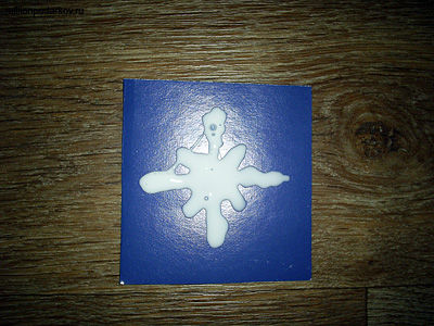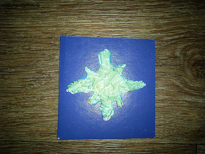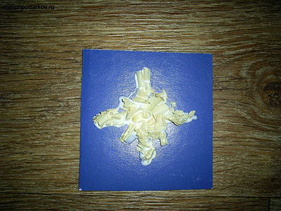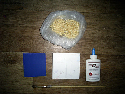 Чтобы сделать картинку в виде снежинки, приготовьте квадратик цветного картона, мелкую древесную стружку, акварельные краски, клей ПВА и кисточку.