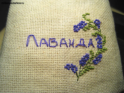 На ткани сделайте вышивку в виде соцветий лаванды. Используйте нитки сиреневых оттенков для цветов.