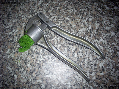 Пропускаем через чеснокодавку зеленое соленое тесто. Получается травка.