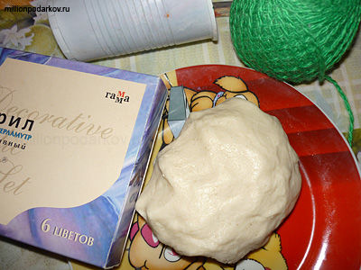 Чтобы получилась поделка из теста с детьми нам потребуется готовое соленое тесто, акриловые краски, кисть, стакан с водой, нитки, ножницы.