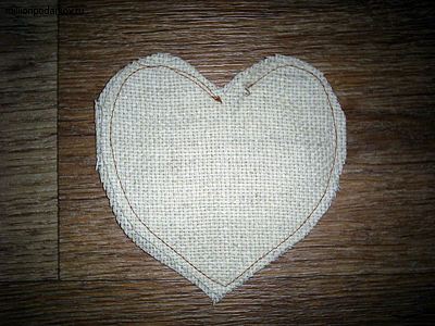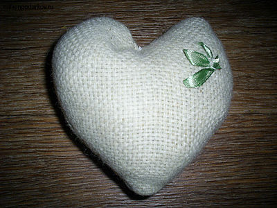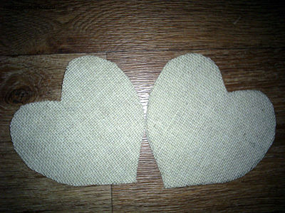 Попробуем сделать ароматное саше с вышивкой атласными лентами. Для этого выкроим из льняной ткани две детали в форме сердца.