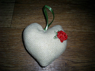 Сделаем розочку из атласной ленты красного цвета. Пришьем ее к поделке. Получилась простенькая, но красивая вышивка. Таким же образом можно вышить все сердце. Если вы решили делать сложную вышивку, то это необходимо сделать сразу после выкраивания деталей и до их сшивания. Иначе вышивать будет сложно.