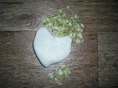 Возьмем любые травы. В данном случае мы наполняли саше хмелем, который действует на человека успокаивающе и помогает при бессоннице. Чтобы быстрее наполнить поделку, воспользуйтесь лейкой с широким горлышком.