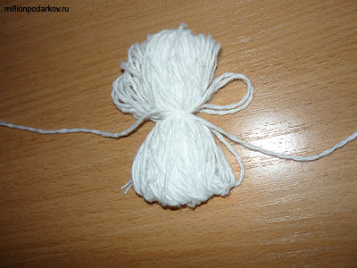 Из белых ниток для вязания делаем помпон. Для этого наматываем на руку нитки, а затем аккуратно снимаем и перевязываем посередине. После этого образовавшиеся петельки расстригаем и распушаем бамбушку.