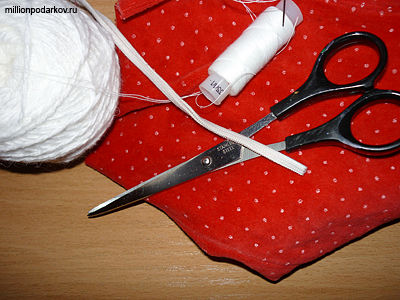 Вам для этой поделки потребуется красный велюр, белые нитки для вязания, бельевая резинка, ножницы, и нитки с иголкой.