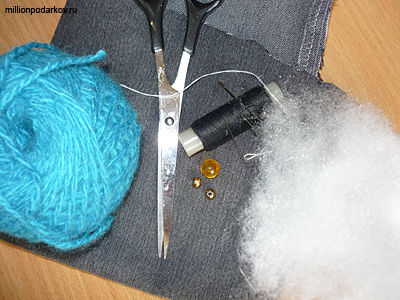 Для того, чтобы у нас получилась поделка из ткани и ниток "Ёжик" необходимо приготовить джинсовую ткань, нитки для вязания, 3 бусины, нитки, иголку, ножницы, синтепон.