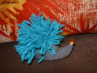 Пришиваем "иголки" к ёжику. Затем ножницами расстригаем петли у помпона. Поделка из ткани и ниток "Ёжик" готова!