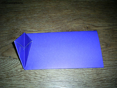 Берем прямоугольный лист бумаги и складываем его пополам. Теперь сверху складываем так, как показано на рисунке.