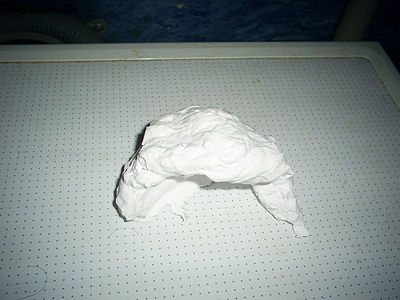 Рвем туалетную бумагу на мелкие кусочки, немного смачиваем водой, все хорошо перемешиваем и максимально измельчаем, добавляем немого клея ПВА и клейстера, опять вымешиваем. Добавляем еще клейстера, чтобы получилась масса, похожая на тесто.