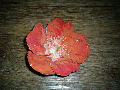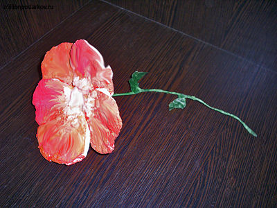 Сделайте сердцевину из кусочка ваты, ватного диска или салфетки. Покрасьте ее белым цветом. Обмотайте проволоку зеленой тейп-лентой. Из нее же сделайте и два листочка. Прикрепите получившийся стебелек к чашечке цветка. Вот что у нас получилось в итоге.
