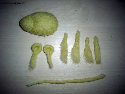 Благодаря энергичным движениям специальной иглы шерсть сваливается. Для того чтобы обозначить на изделии выемки, в этих места больше работаем иглой, а для выпуклостей добавляем еще шерсти и приваливаем ее к поделке в нужном месте. Вот мы и сформировали тело и голову мышки. С одного конца она заостренная, а с другого округлая. Кроме того, на границе головы и тела хорошо видна выемка.