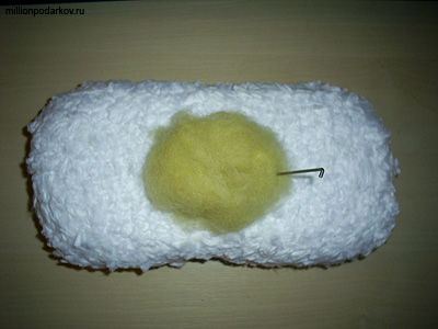 Итак, отщипываем от клубка шерсти небольшой кусок, который должен быть раза в три больше от желаемого размера готового изделия. Руками формируем из комка форму мышки. Теперь начинаем сам процесс сухого валяния, для чего иглой протыкаем этот комок. Валять следует лишь на толстой губке, поскольку иголка очень острая, ею легко пораниться.