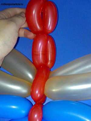 Надуваем третий шар ШДМ - это будет тело бабочки. Сгибаем шарик пополам и вставляем в образовавшуюся петлю задние крылышки бабочки. Затем закрепляем их путем перекручивания.