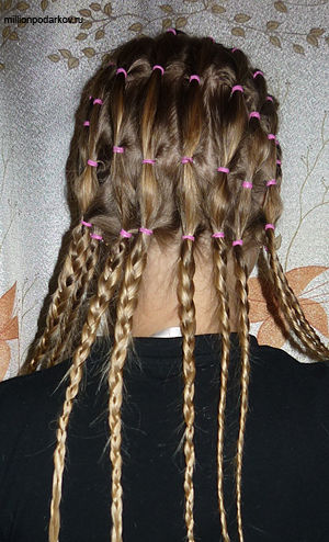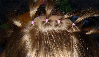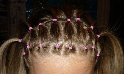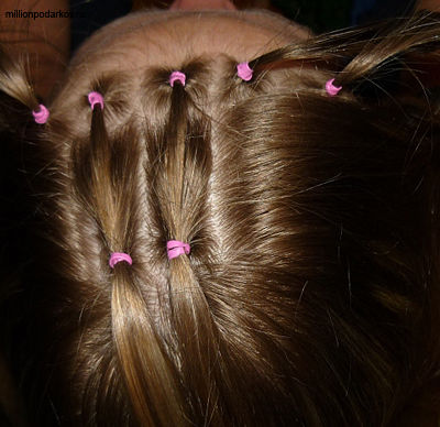 Когда вся голова будет покрыта маленькими скрепленными хвостиками, заплетаем косички. Закрепляем их нашими самодельными резиночками.