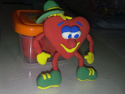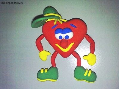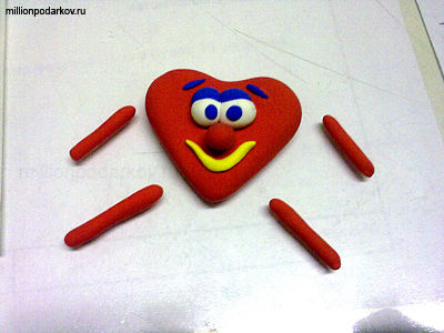 Сердечку делаем веселое личико. Вылепливаем из глины нос, рот, глазки, бровки. Приклеиваем детальки на ПВА. Затем катаем колбаски для ножек и ручек.
