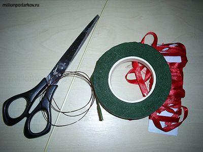 Итак для изготовления поделки к дню святого Валентина Вам понадобится проволока, красная атласная лента, ножницы, зеленая тейп-лента, бамбуковая шампура и скотч.
