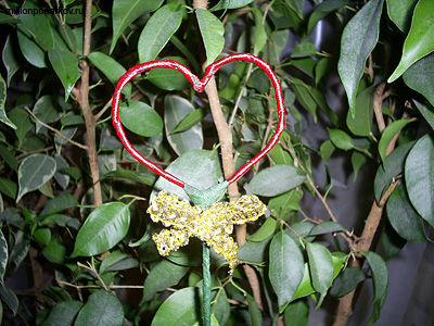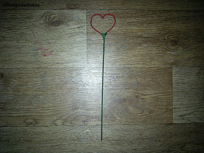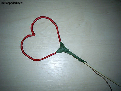 Из проволоки делаем сердечко и обматываем его красной атласной ленточкой. Для того чтобы она не раскрутилась, ее начало и конец следует скрепить кусочком скотча. Теперь берем бамбуковое шампура и крепим к нему с помощью тейп-ленты проволочное сердечко.