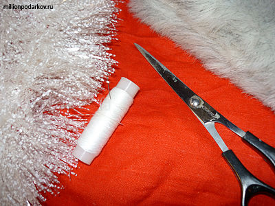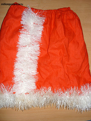 Для того, чтобы сшить такой костюм вам потребуется ткань красного цвета, белый мех, бельевая резинка, красная рубашка или футболка, белая мишура, ремень, ножницы, нитки.