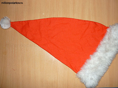 Для того, чтобы сшить такой колпак. Вам необходимо вырезать из ткани большой равнобедренный треугольник. С длинной основания примерно 56-60 см, в зависимости от окружности вашей головы. Затем треугольник сшивается. И у вас получается колпачок. К острому концу пришиваем помпон, а к низу пришиваем мех.