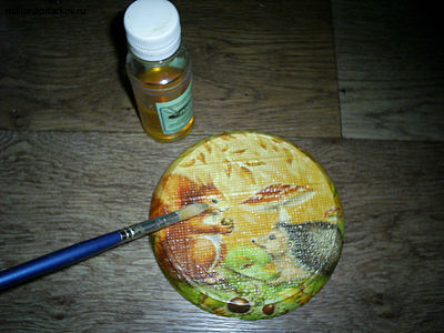 Вырезаем мотив, приклеиваем и покрываем лаком