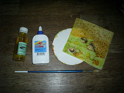 Вырезаем из салфетки нужный мотив, отделяем верхний красочный слой и приклеиваем клеем ПВА его к тарелке. Клей следует предварительно наносить на поверхность мисочки. Приглаживаем салфетку кусочком паралона. Ждем, когда изделие высохнет. Теперь нам осталось лишь покрыть тарелочку слоем лака. Его удобно наносить с помощью губки или паралона.