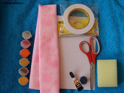 Для поделки ко Дню Валентина нам понадобится картон, краски, губка, ножницы, клей, скотч двусторонний и оберточная бумага. Скотч должен быть толстым. Оберточная бумага должна быть плотной, чем плотнее, тем лучше.
