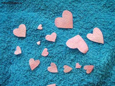 Из оберточной бумаги вырезаем сердечки. Все сердечки должны быть различного размера.