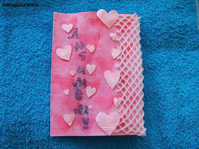Теперь открытку нужно оформить. Для этого мы сбоку приклеили сеточку, написали клеем слово «Любимый» и посыпали его блестками. Затем нужно приклеить на двусторонний скотч вырезанные ранее сердечки. Высоту можно варьировать, делая то двойной, то тройной слой скотча. Когда все украшения будут завершены, поделка ко Дню Валентина будет готова. Можно подписывать и дарить ее.
