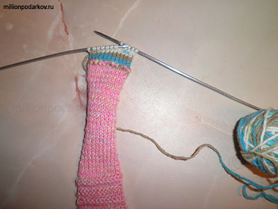 Вяжем на двух спицах полоску лицевой гладью, ширина которой и будет шириной браслета.