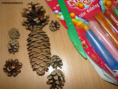 Для того, чтобы получилась поделка медведь из шишек приготовьте еловые и сосновые шишки. А еще вам понадобится пластилин.