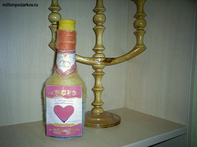 Берем нитки и начинаем обматывать ими бутылку. Это удобнее делать сверху вниз. Там, где нитки начинают спадать или наползать друг на друга, приклеивайте их клеем ПВА. Вот такая замечательная бутылочка у нас получилась. Но это еще не все. Ведь мы хотим сделать из нее свадебный подарок.