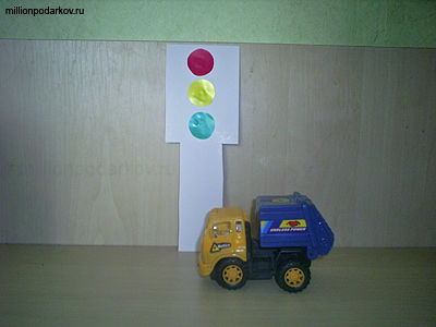 Теперь наклейте кружочки на картон. Сначала сверху должен быть красный кружечек, потом желтый и снизу зеленый. Вот такой замечательный и несложный светофор у нас получился. Осталось лишь достать машинки, куколки и начать моделировать различные ситуации на дороге.