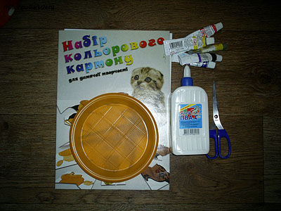 Для изготовления поделки на тему тигренок подготовим такие материалы, как одноразовая тарелка, акриловые или гуашевые краски, цветной картон, ножницы, клей ПВА и кисточку.