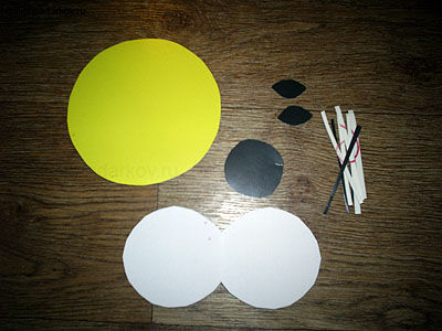 Вырезаем из цветного картона элементы мордочки тигра. Сделаем оранжевый фон, черные глазки, носик, черные усики.