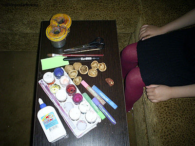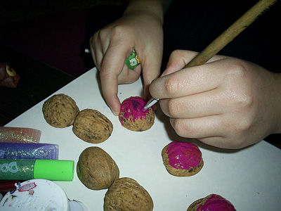 Берем половинки скорлупы от грецкого ореха и красим их гуашью, не доходя до края скорлупки.