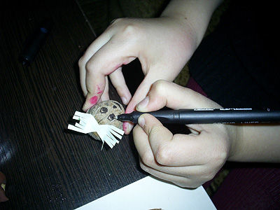 Из цветной бумаги вырезаем прямоугольник и надрезаем края. Приклеиваем к целому грецкому ореху. Черным маркером рисуем мордочку.