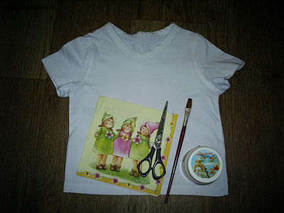 Для того чтобы сделать декупаж по ткани, мы использовали такие материалы, как детская белая футболка, салфетка с рисунком, кисточка, клей для декупажа по ткани, ножницы и кисточку.
