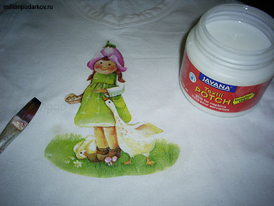 Футболку стираем и гладим. Вырезаем из салфетки нужный мотив, отделяем верхний красочный слой. Обильно покрываем место на футболке, где будет рисунок, клеем для декупажа по ткани, прикладываем рисунок и сверху мягкой кисточкой снова обильно покрываем клеем.