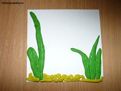 Лепим из пластилина маленькие шарики и приклеиваем их на листок бумаги - это песочек. Затем лепим колбаски и размещаем их на листе - это водоросли.