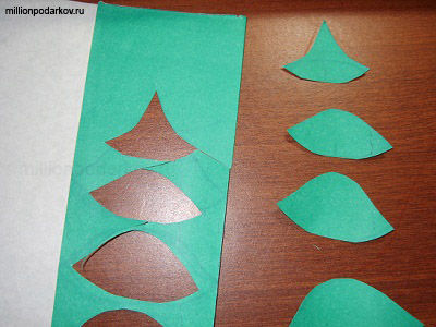 На начальном этапе изготовления поделки с детьми 2-7 лет «Елочка» вам нужно взять лист зеленой цветной бумаги. На нем нужно нарисовать формы листвы будущей елочки. Причем каждая форма должна быть вырезана дважды, чтобы поделка с детьми 2-7 лет «Елочка» получилась цветной со всех сторон.