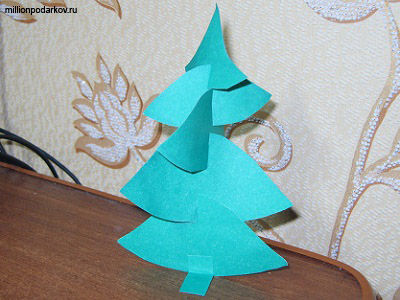 Получилась у нас елка, но она не устойчива, поэтому нужно сделать для нее подставку. Для этого вырезаем 2 полоски шириной порядка 1-2 см. эти полоски приклеиваем снизу к елке с двух сторон, чтобы получилась опора. Все, поделка с детьми 2-7 лет «Елочка» готова.