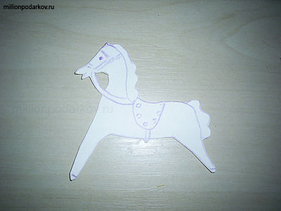 На листе плотной белой бумаги рисуем лошадку, вырезаем ее.