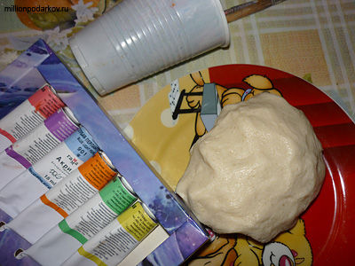 Для того, чтобы у нас получилась поделка снегирь из соленого теста нам потребуется соленое тесто, акриловые краски, стакан с водой, кисть.