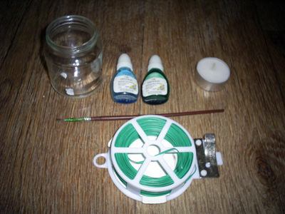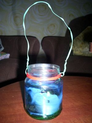 Для поделки вам понадобится небольшая баночка, витражные краски синего и зеленого цвета, проволока, свечка.