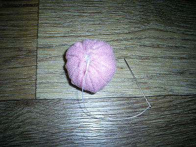 Из кусочка фетра делаем нос. Для этого выкраиваем круглую деталь и прошиваем иголкой с ниткой по краю. Стягиваем и наполняем холлофайбером.