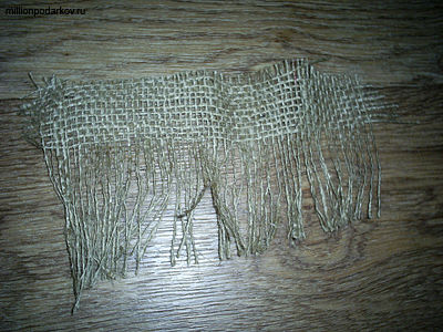 Чтобы сделать бороду, вырежем из мешковины прямоугольник. Внизу сделаем бахрому, вытаскивая нитки.