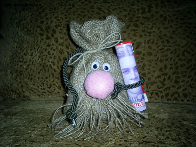 Приклеиваем к мешочку-туловищу бороду, нос, глазки, ручки и денежку. Вот такой забавный домовичек Кузя у нас получился в итоге. Теперь его можно поставить напротив входной двери, чтобы он привлекал в дом деньги или подарить друзьям.