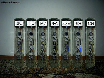 Итак, для изготовления бутылочного ксилофона нам понадобится 7 бутылок (количество, равное семи задано благодаря количеству нот). Также подготовьте воду и металлическую палочку. Если у Вас есть пианино, то с помощью него можно будет провести настройку ксилофона. Расставляем бутылки в ряд и наливаем в них воду. В первую бутылку налейте воды высотой в 1 см, в следующую бутылку чуть больше и т.д.
