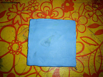 Берем кусочек пластилина голубого цвета и размазываем его по дощечке. Стараемся делать это как можно более равномерно.